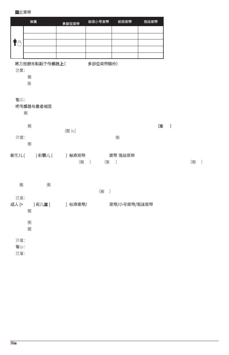 警示:当固定束带粘性不足以将传感器粘贴在患者身上,或固定束带因过度使用而被污染时,必须更换固定束带。