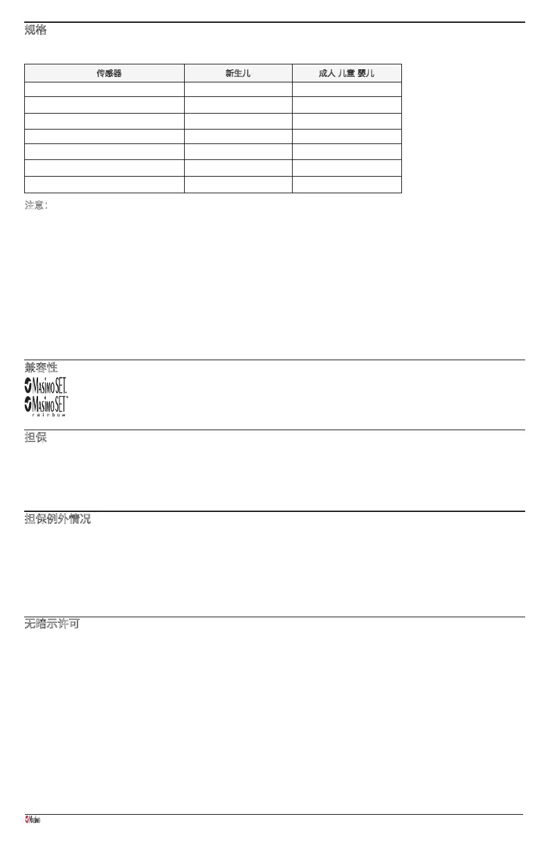 本传感器仅可与包含 Masimo SET 血氧仪的设备或获准使用 YI 传感器的脉搏血氧监测仪配套使用。每个传感