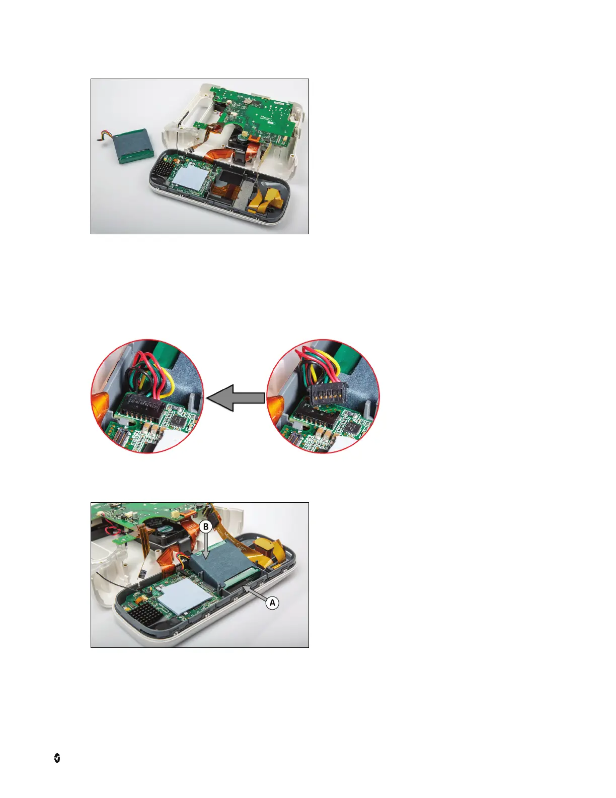 3. Noting the battery orientation during removal, install the battery into the Rad-97 faceplate at an angle against the foam (A). While applying slight pressure against