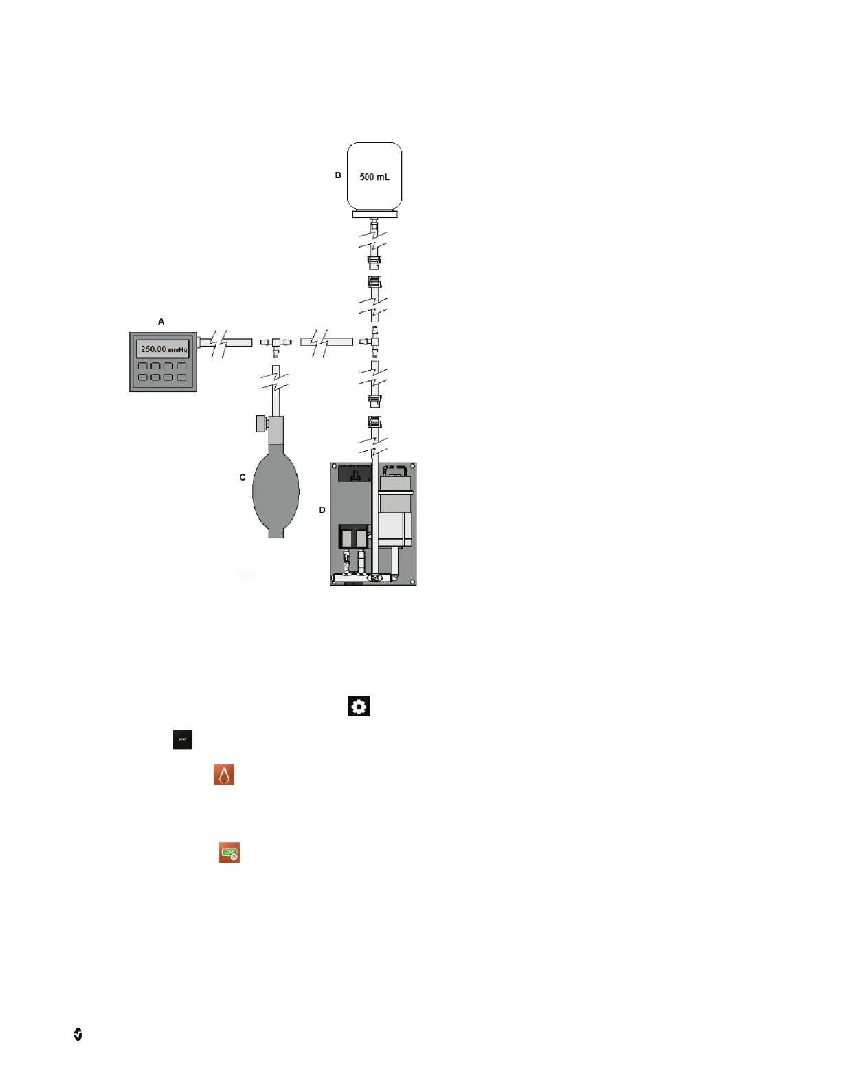 1. Connect the manometer (A), 500mL bottle (B), and hand bulb (C) to the NIBP module (D) using "T" adapters and connection tubing.
