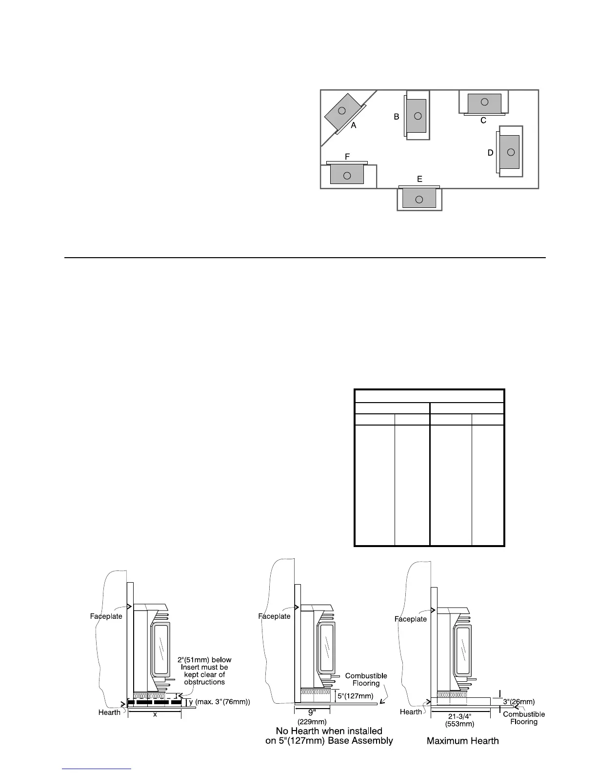 12" (305 mm) in front of this appliance. The Zero Clearance Kit allows for a hearth up to 3" (75 mm) thick above