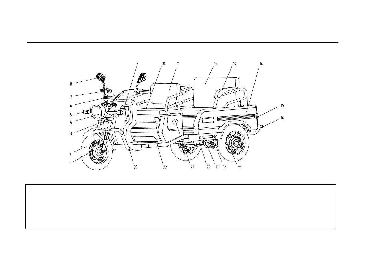 1. Front fork 2.Front wheel 3.Horn 4.Headlight 5.Turning light 6.Speedometer 7.Throttle 8.Rearview