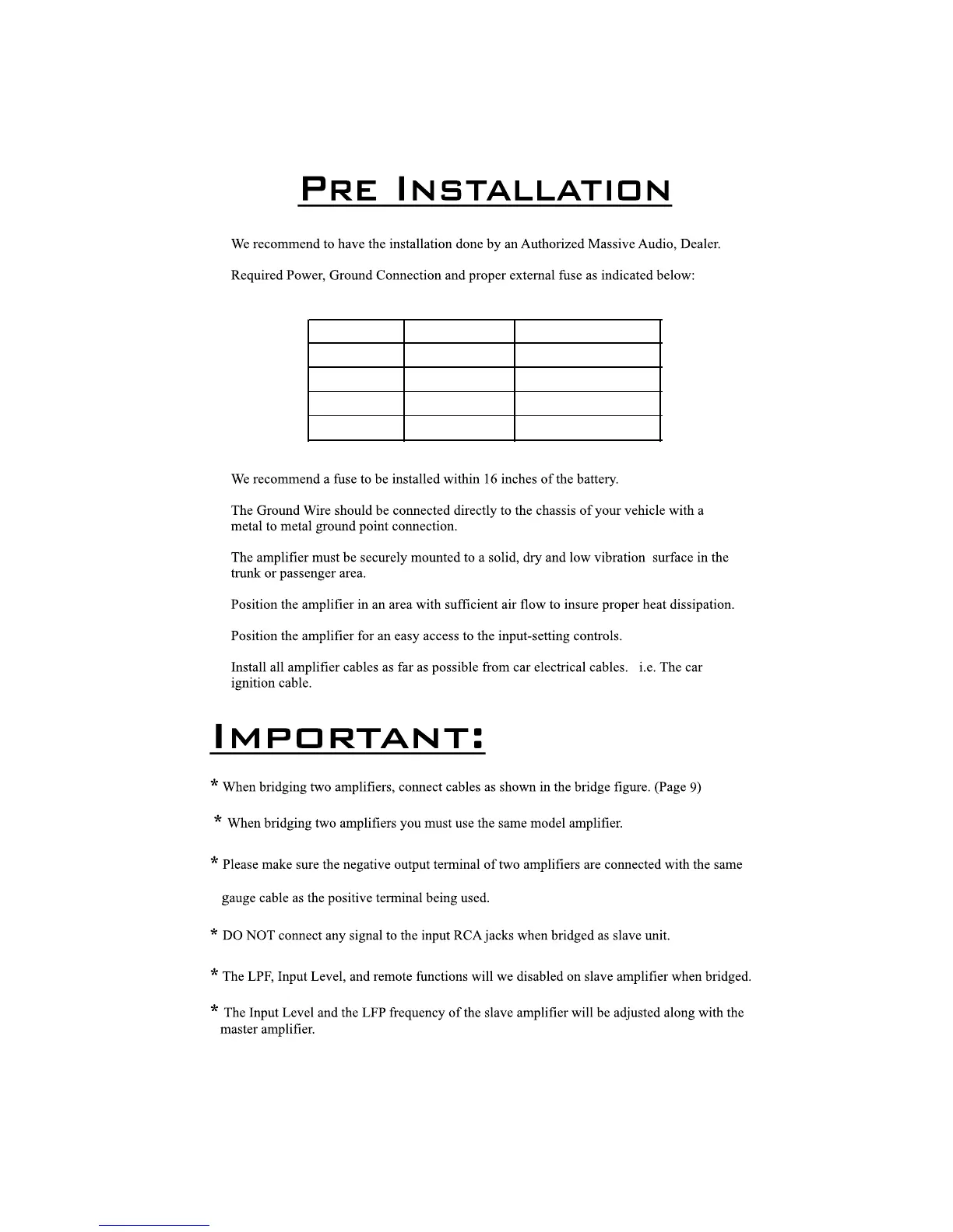 Massive Audio DB3000 - Pre-Installation Guidelines; Professional Installation Recommendation; Power, Ground, and Fuse Requirements