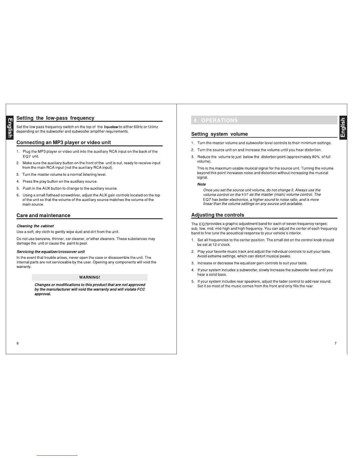 Massive EQ7 - Operating the EQ7 Equalizer; Setting System Volume Levels; Adjusting Equalizer and Fader Controls; Setting Low-Pass Frequency