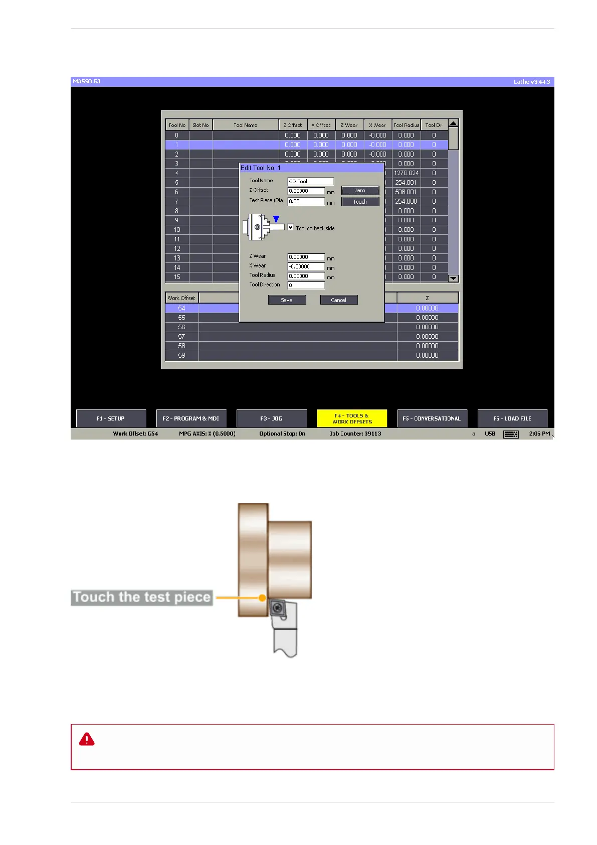 Step 6: Now go to F3 – Jog/Rapid screen and touch the tool to the side of the test piece.