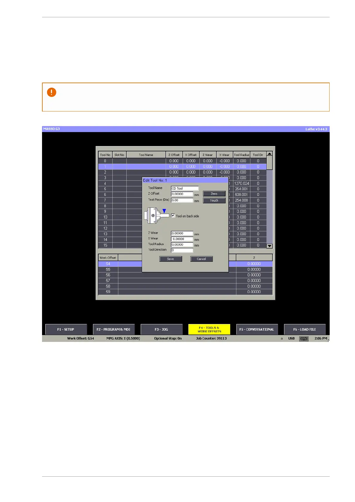 Step 8: Go back to F4-Tools & Work Offset screen and enter the measured diameter value in Test Piece