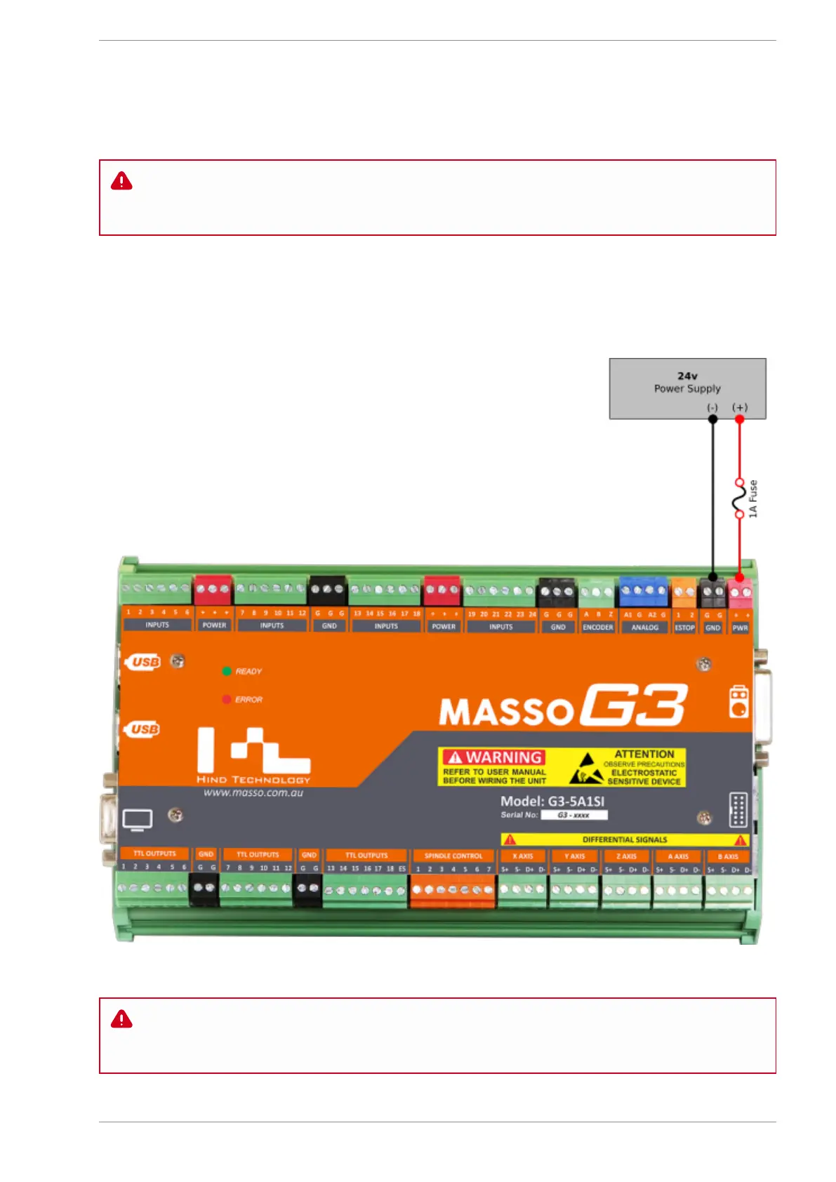 WARNING: The installation of a 1 amp fuse between your Power Supply and MASSO is required