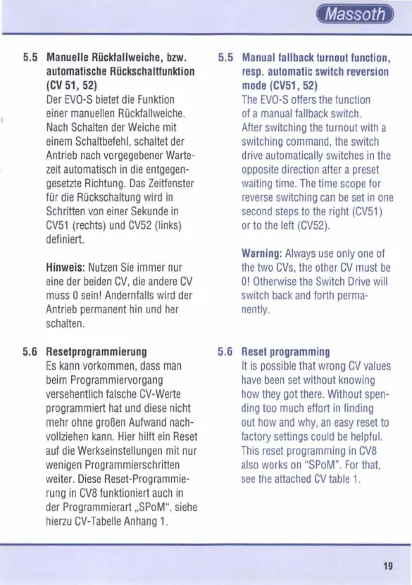 Massoth EVO-S - Manual Fallback Turnout Function; Reset Programming