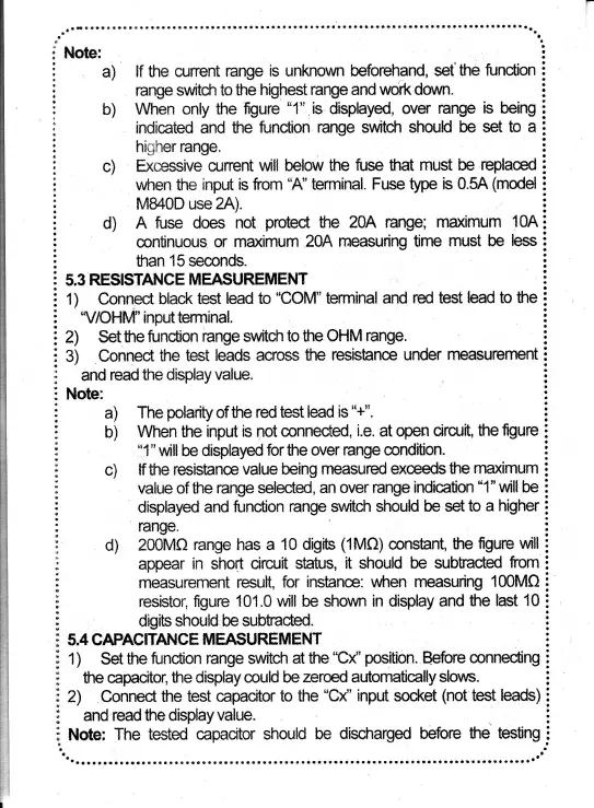 Mastech M840D - Resistance Measurement; Capacitance Measurement
