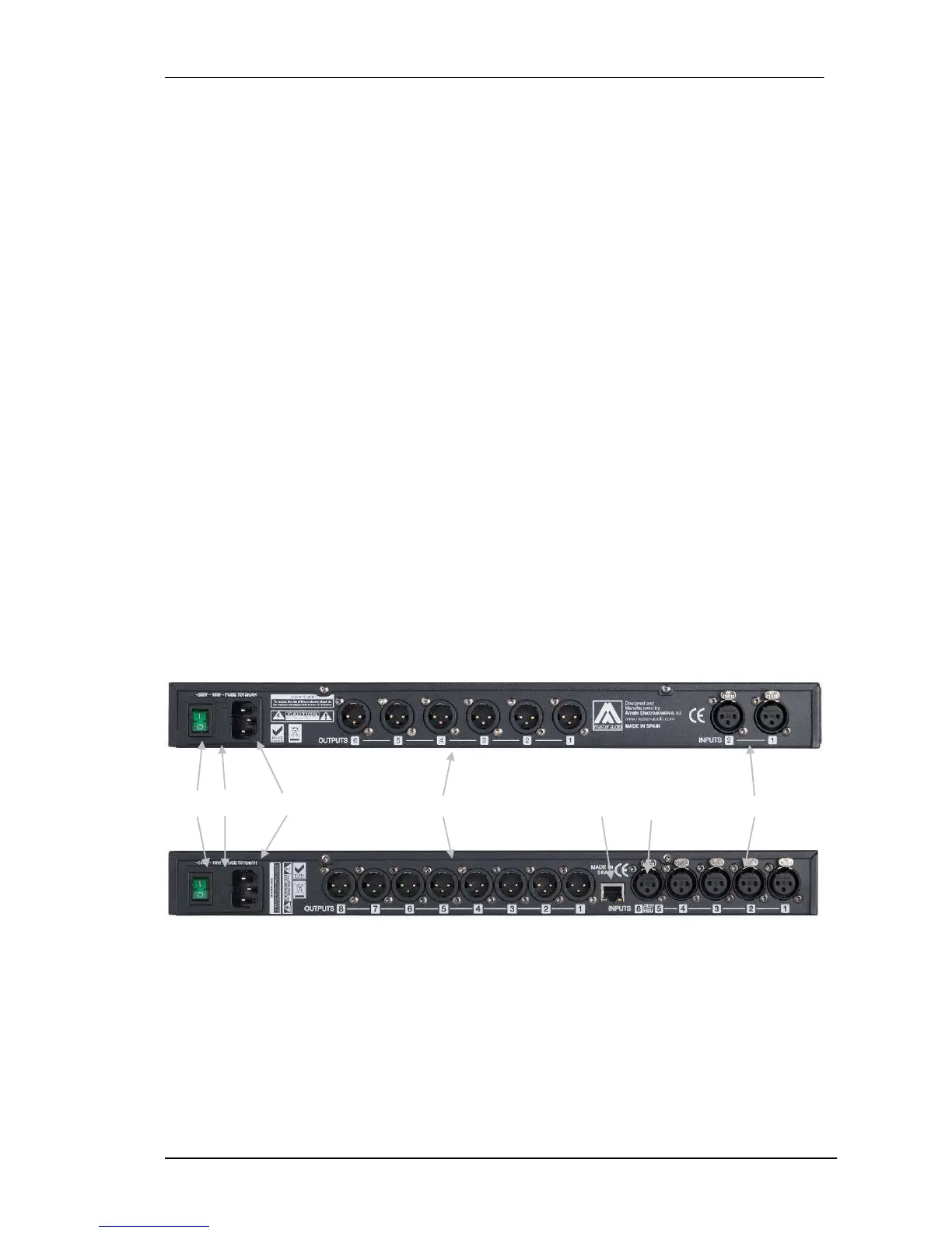 H) LEDs de señal de salida – Muestran el nivel actual de señal en cada salida: