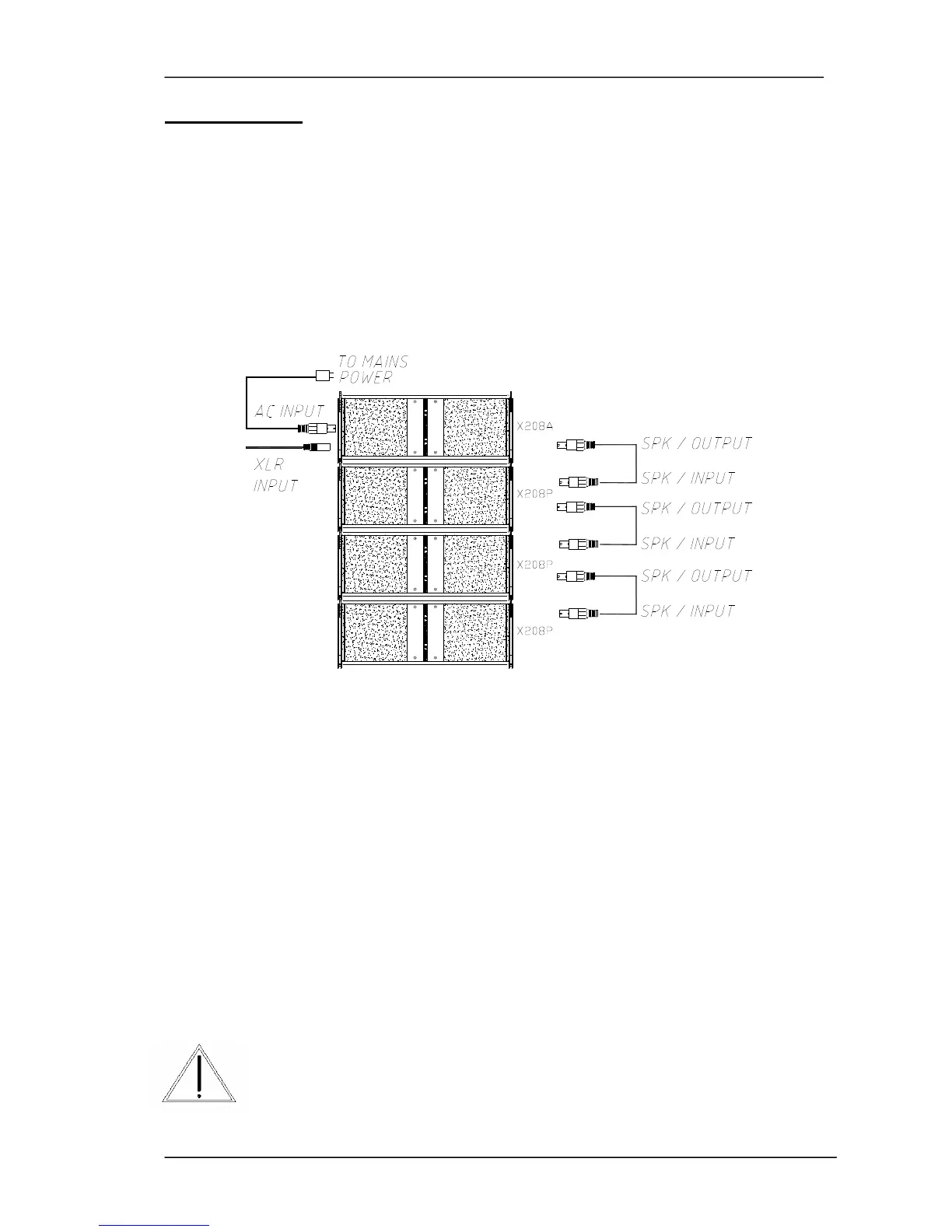 Connect the signal (mixing desk output) to XLR INPUT on the first active X208A unit.