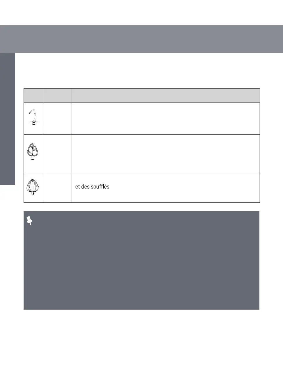 • Fouet : avant de battre de la crème ou des blancs d’œufs, assurez-vous que le bol et le