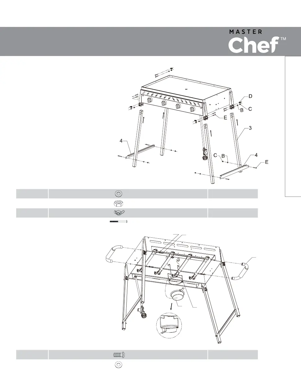 brace (4) on the right using long screws (E), washers (B) and nuts (C).
