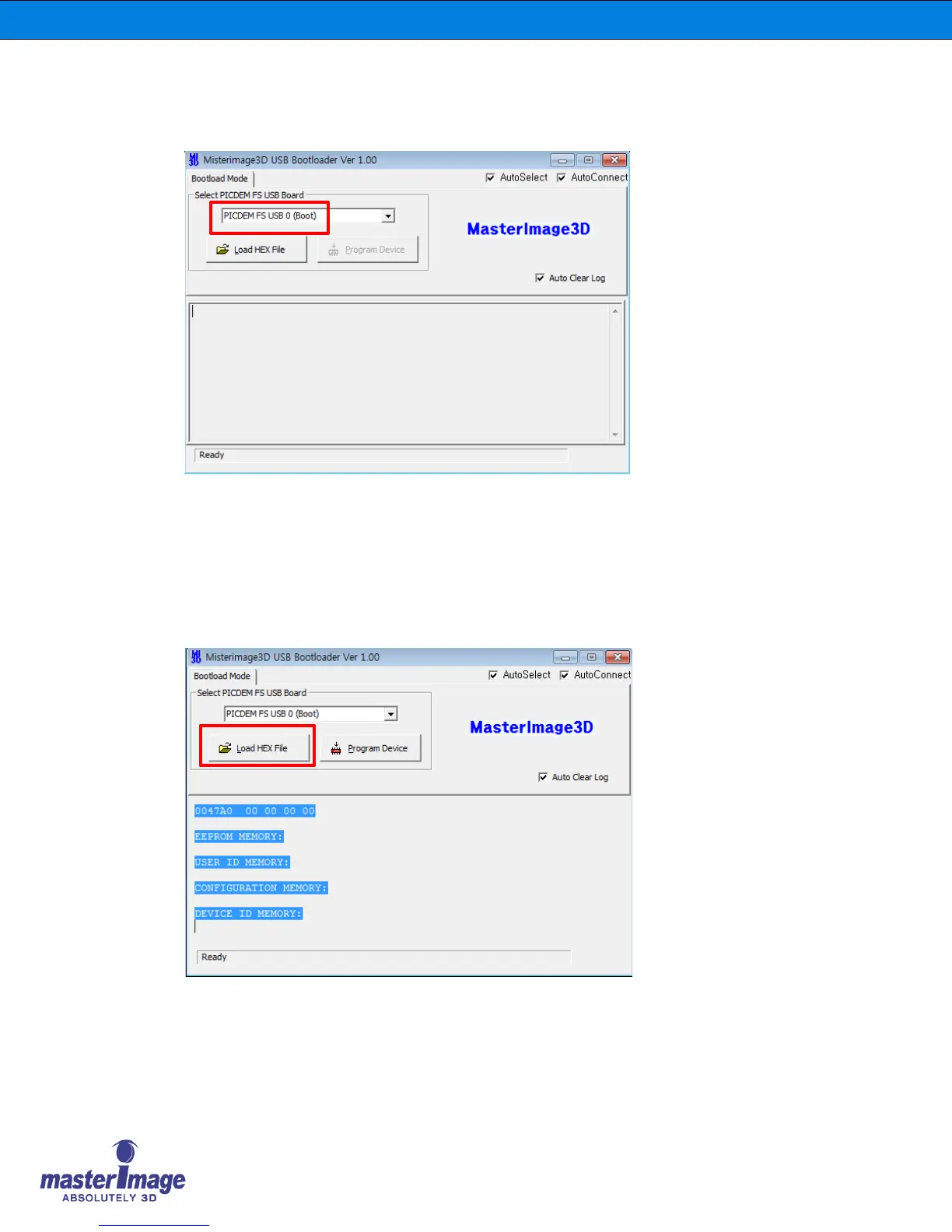 4. Click the ‘Load HEX File’ button and locate the previously saved upgrade file on your