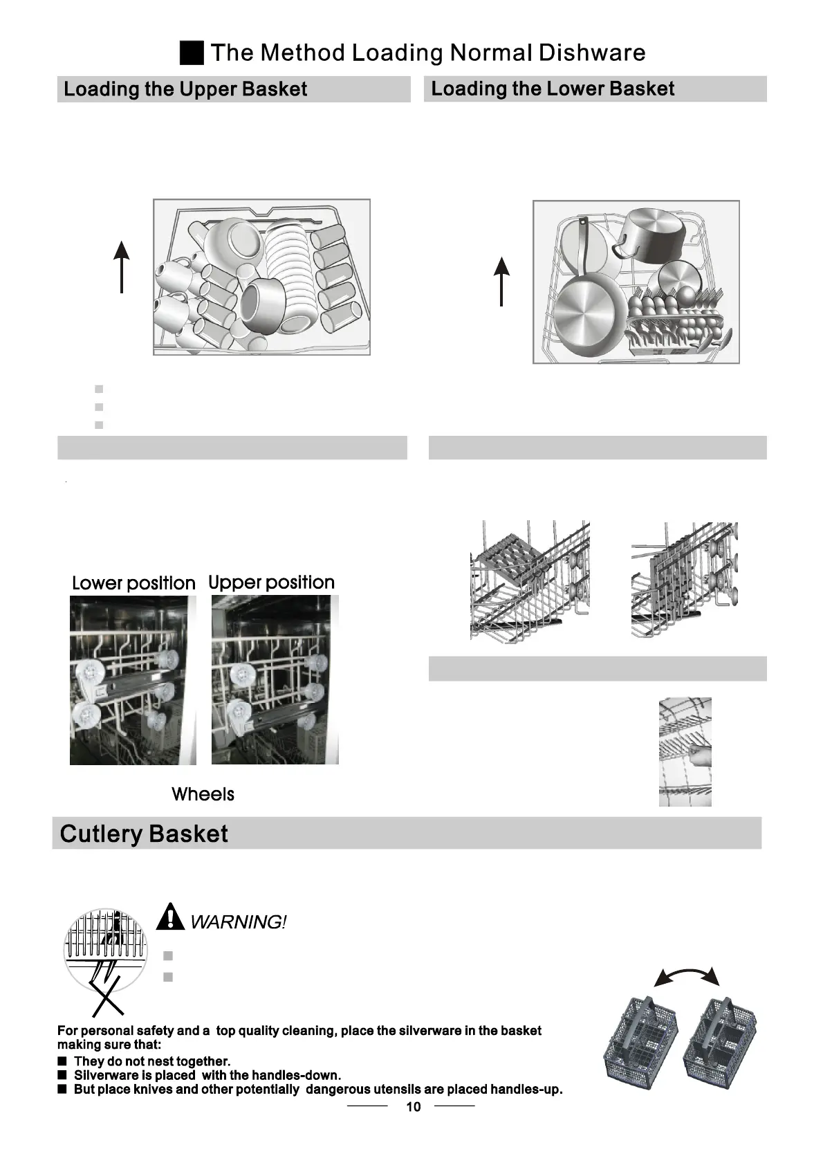 Cutleryshouldbeplacedinthecutlerybasketwiththehandlesatthebottom.Iftherackhassidebaskets,the