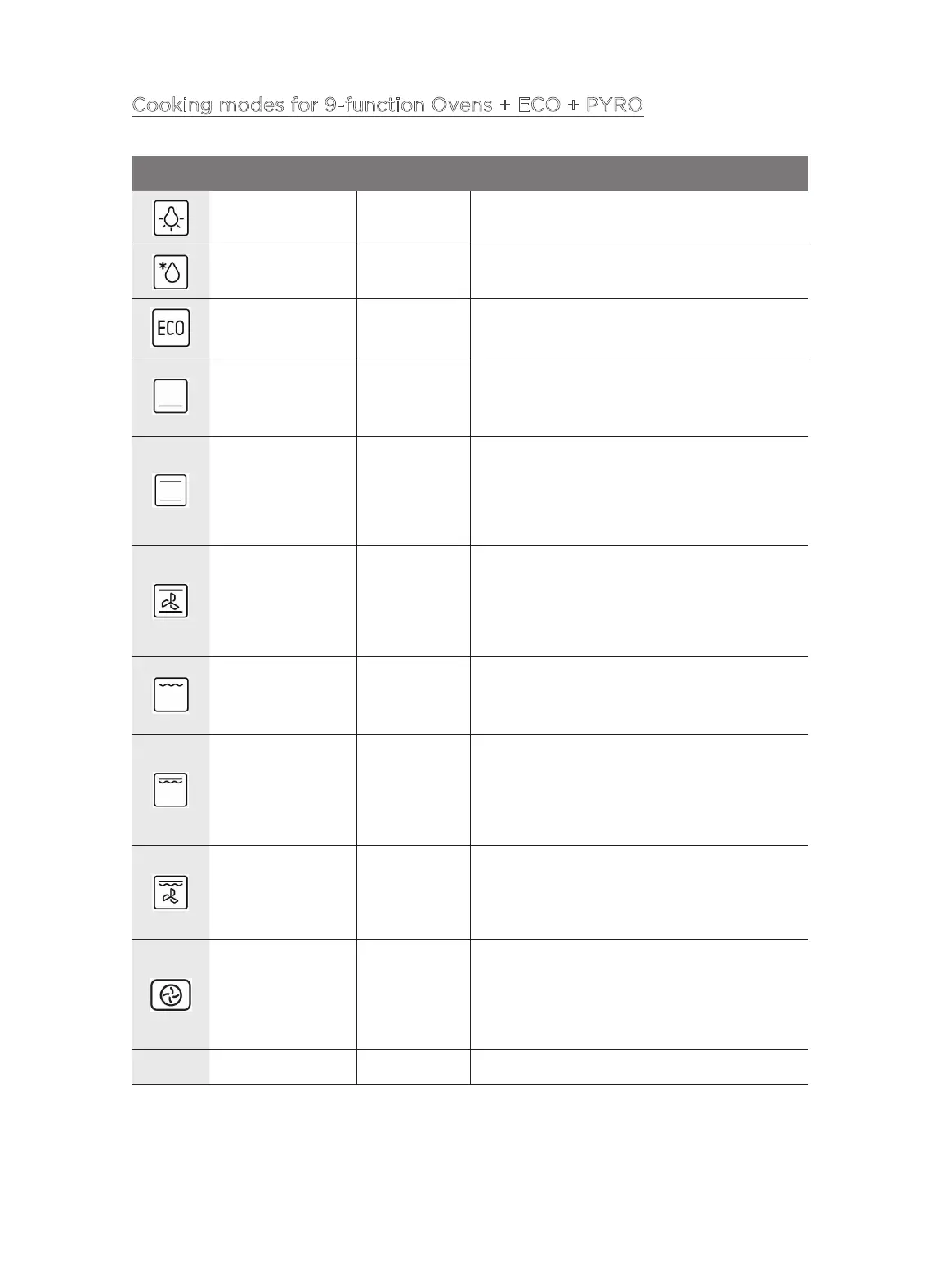 Cooking modes for 9-function Ovens + ECO + PYRO