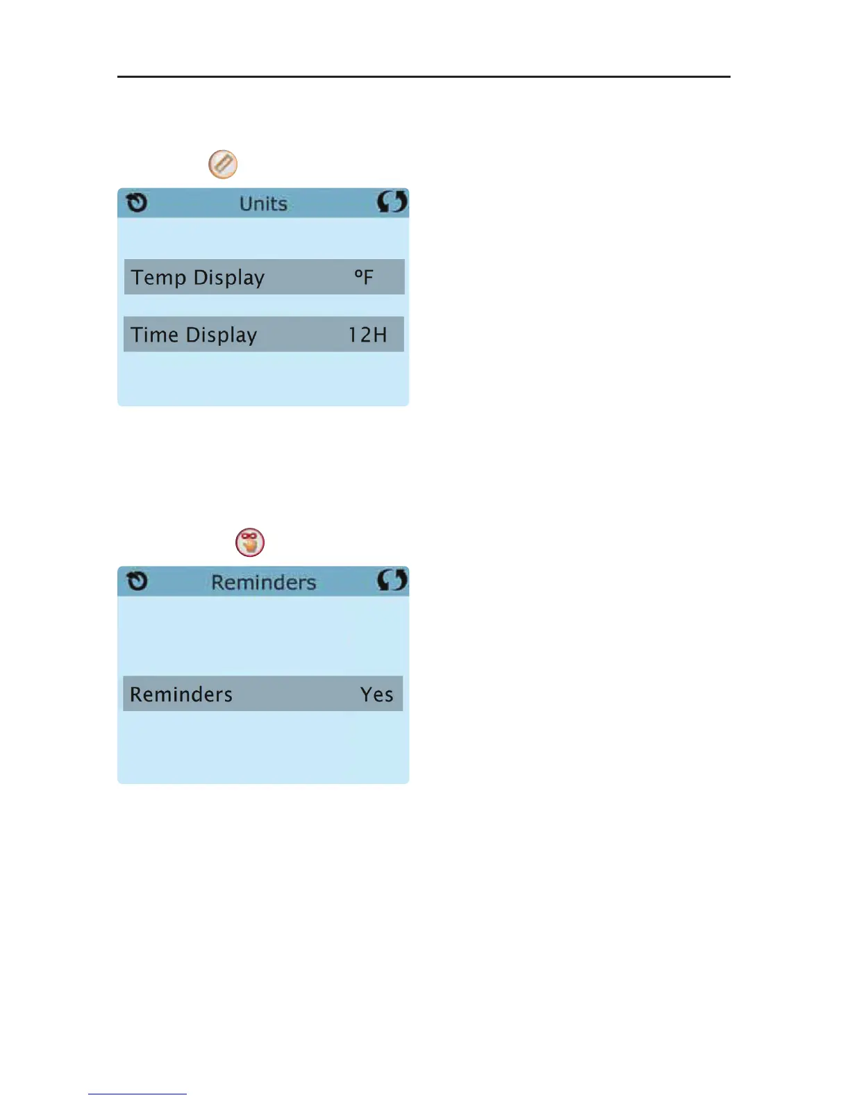 Press “Reminders“ to turn the reminder messages (like “Clean Filter”) ON (Yes) or OFF (No).