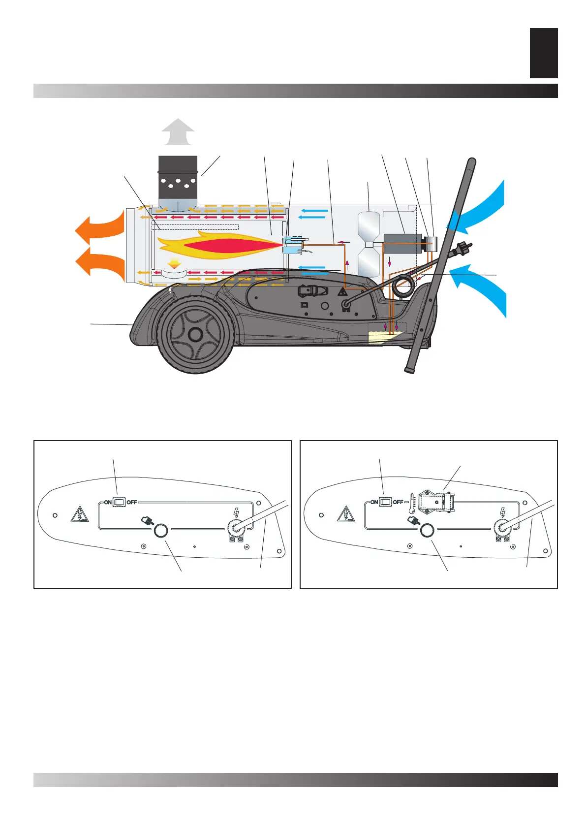 1. Main cable, 2. Reset button, 3. Power cable, 4. Socket for ambient thermostat.