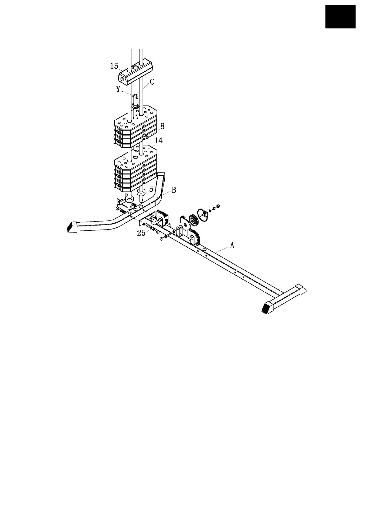 3. Slide weight plates (14) and top plate (15) onto guide rods (C).