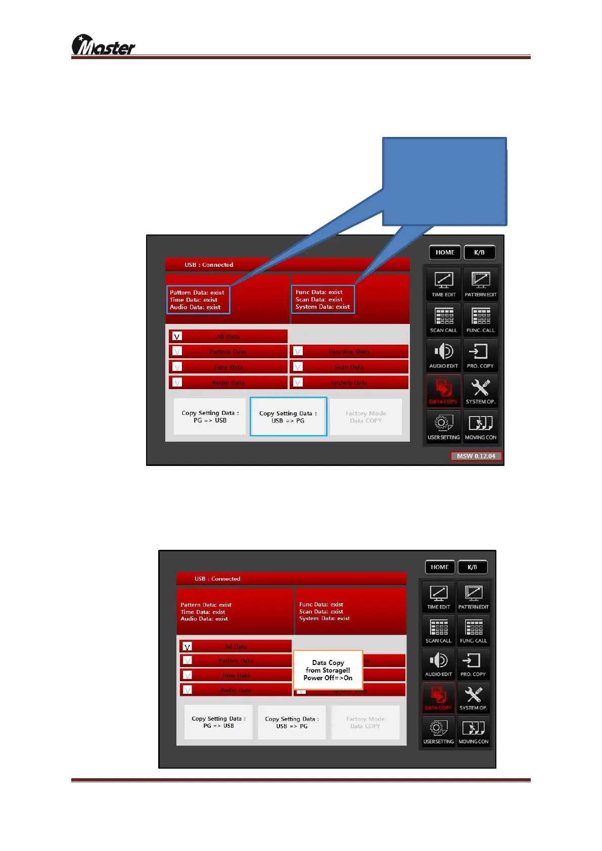 ⑤ Select the “Copy Setting Data: USB => PG”, it means all USB data copy to MSPG-8000. Existing data