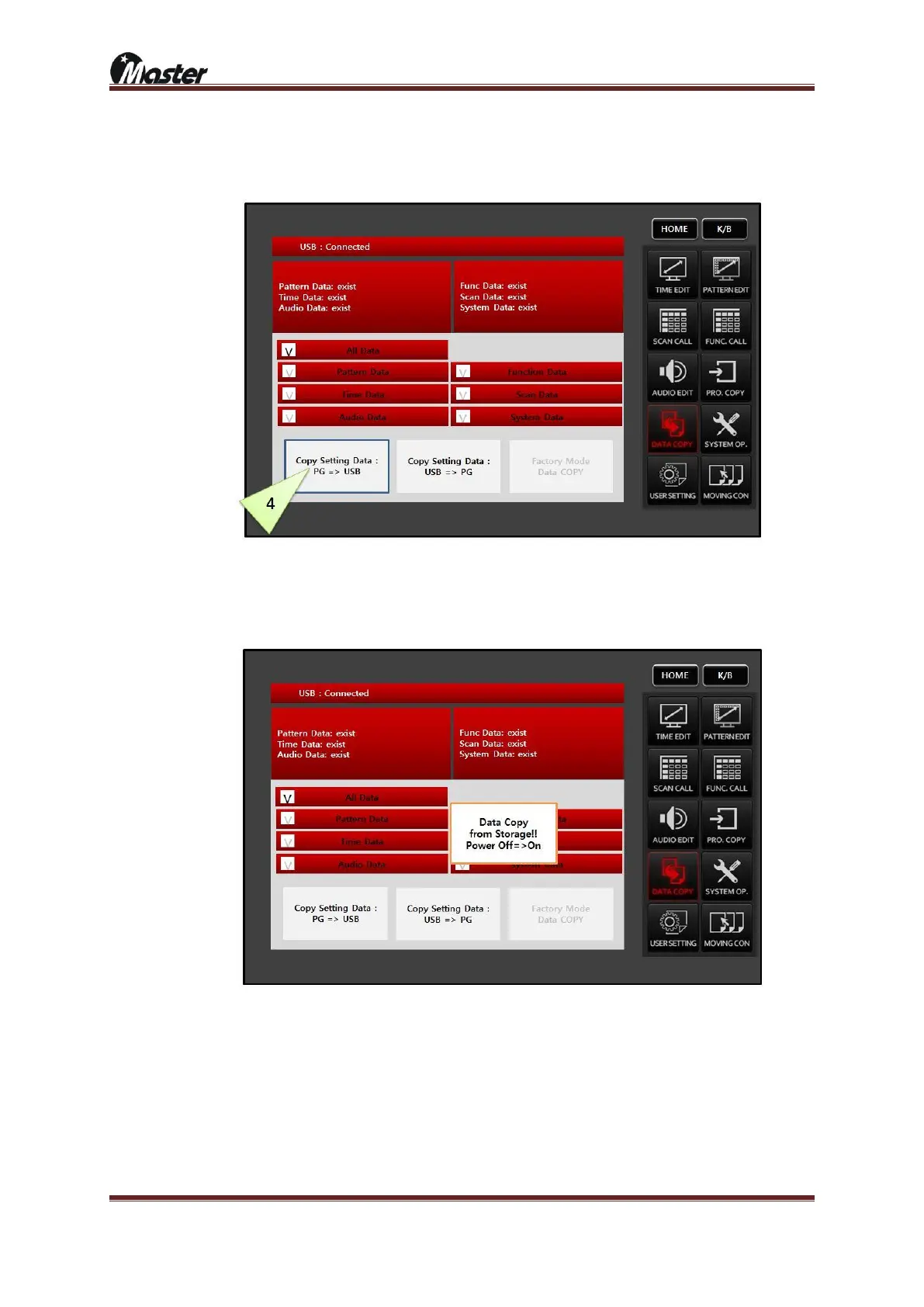 ④ Select the “Copy Setting Data: PG => USB”, it means all MSPG-8000’s set up data will back up to USB