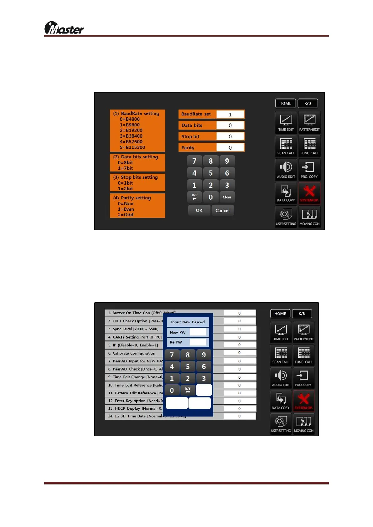 stop bits and parity same as PC and UART setting.(password is “8880”)