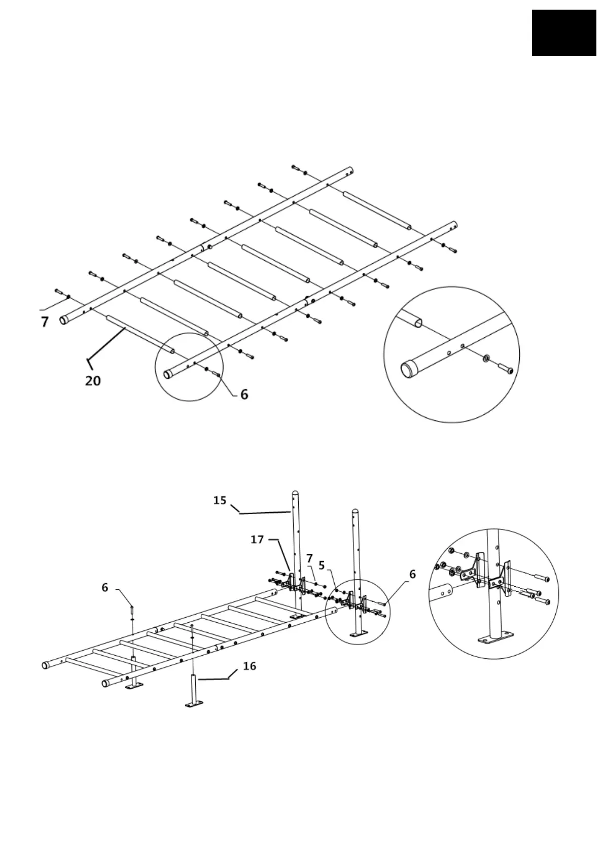 3. LÉPÉS: Rögzítse a 15-ös (2db), a 16-os (2db) rudakat a 17-es T-alátéttel (4db), a 6-os csavarokkal (10db), a