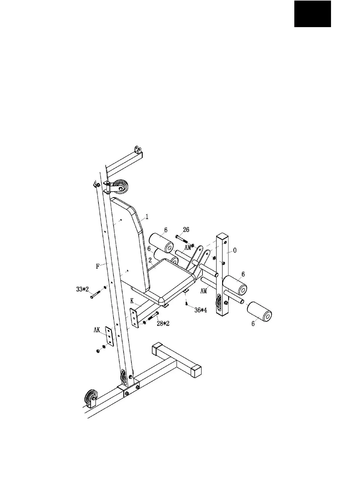4. Należy przymocować duże oparcie pod plecy (1) do głównej belki pionowej (F) za pomocą 2 śrub M8*65 i 2