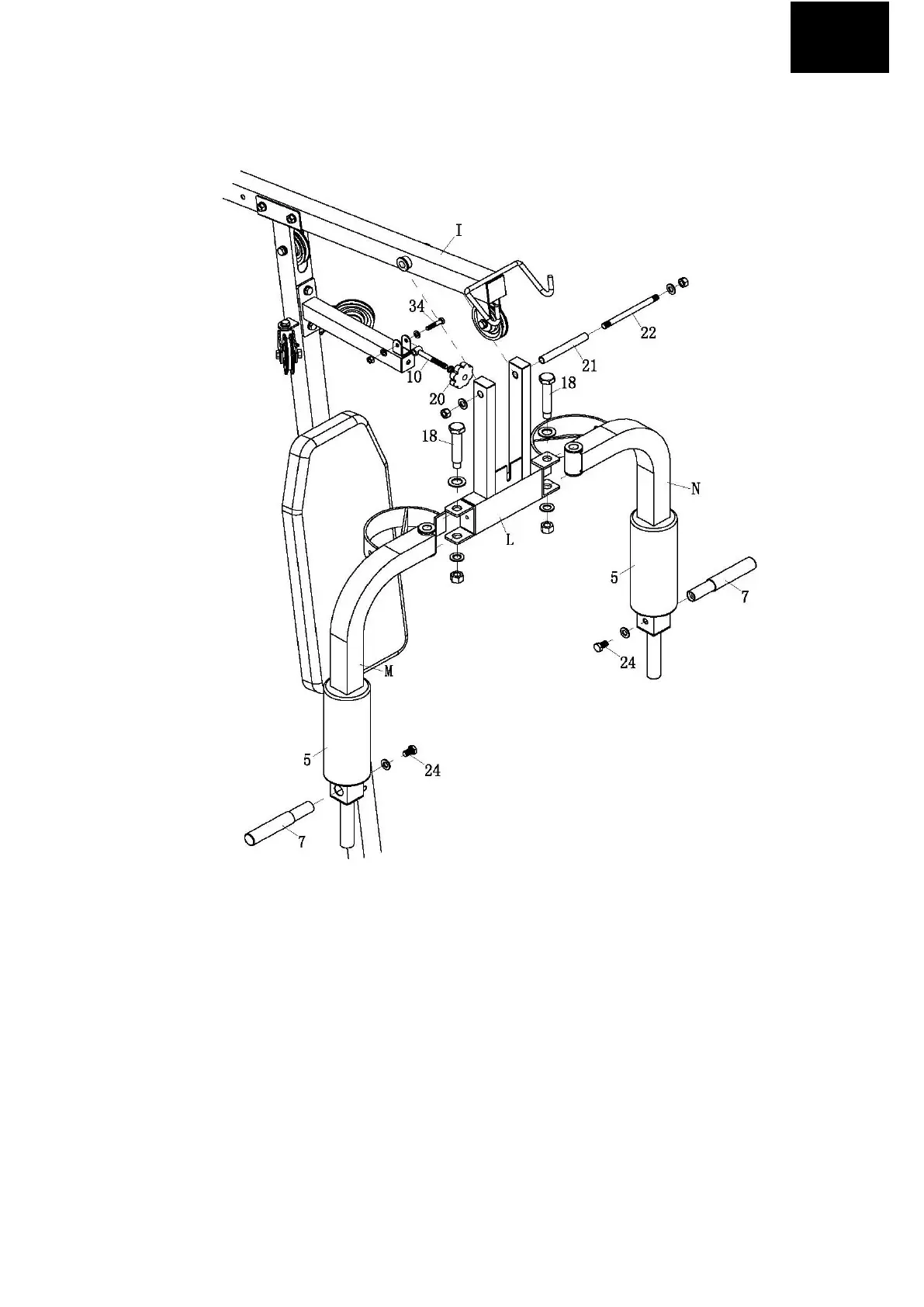 1. Należy przymocować dźwig klatki piersiowej (L) do wspornika głównego (I) za pomocą rurki łączącej (21) i śruby