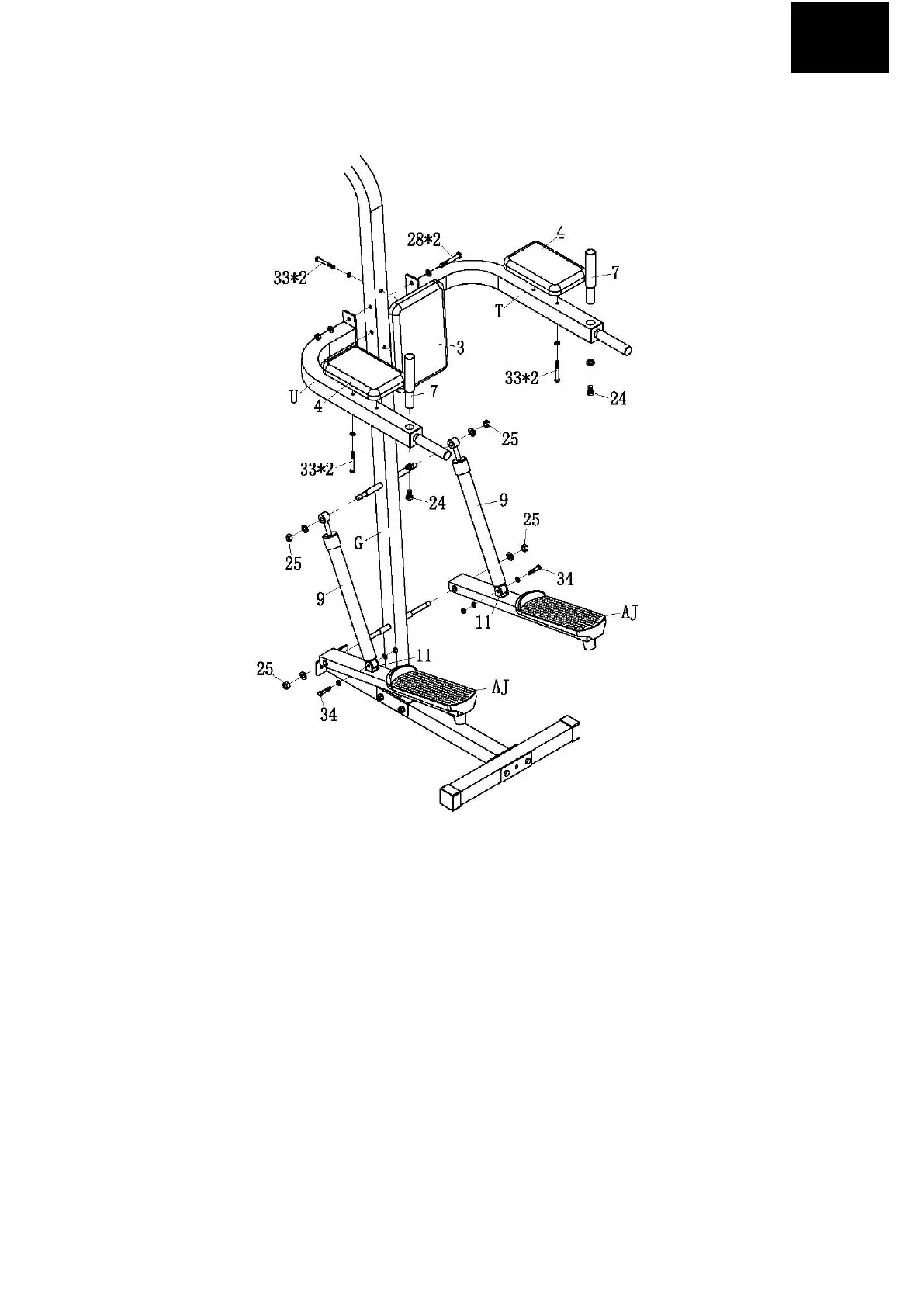 3. Należy przymocować oparcie rąk (4) do ramion (T&U) za pomocą 2 śrub M8*65 i 2 podkładek (33) według