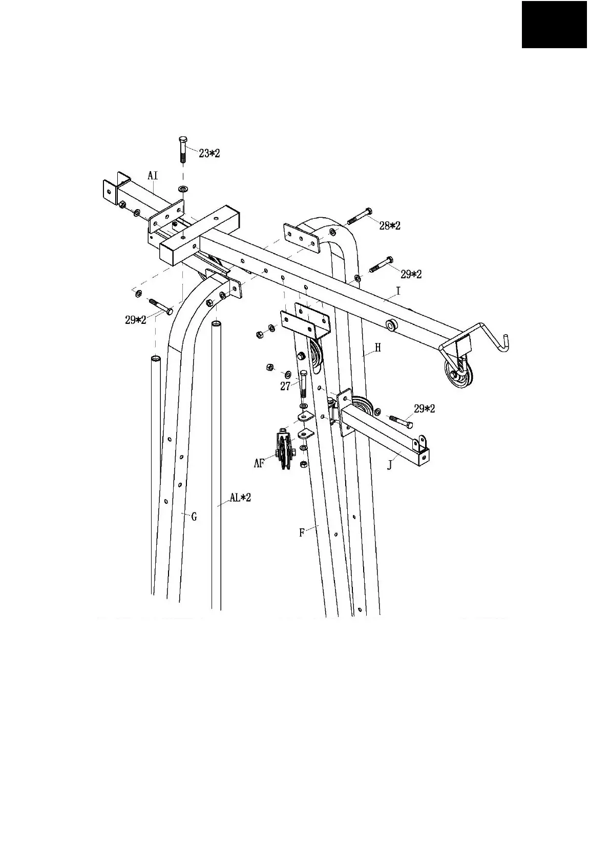 1. ATTACH TOP CROSS BEAM (I) TO MAIN VERTICAL SUPPORT (F) WITH TWO