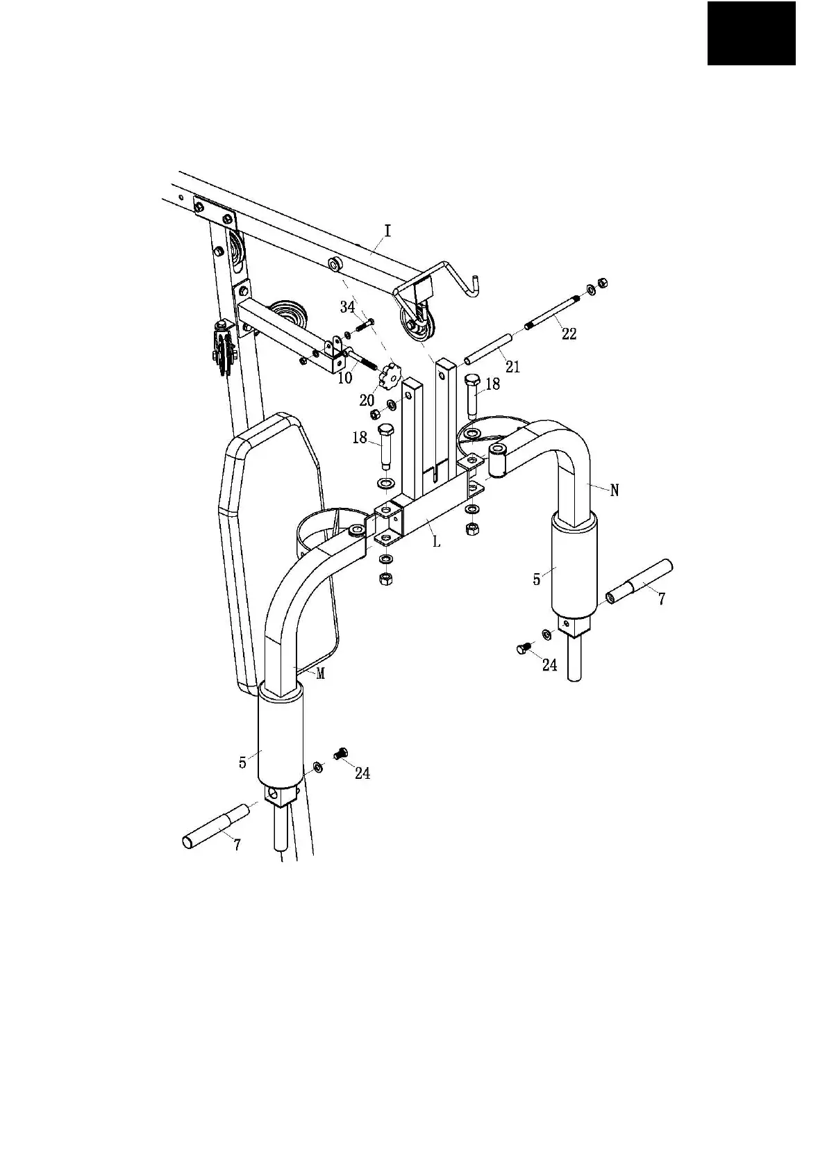 3. INSTALL CHEST SUPPORT (M&N) TO PRESS BAR (L) WITH TWO BIG PIN AND FOUR