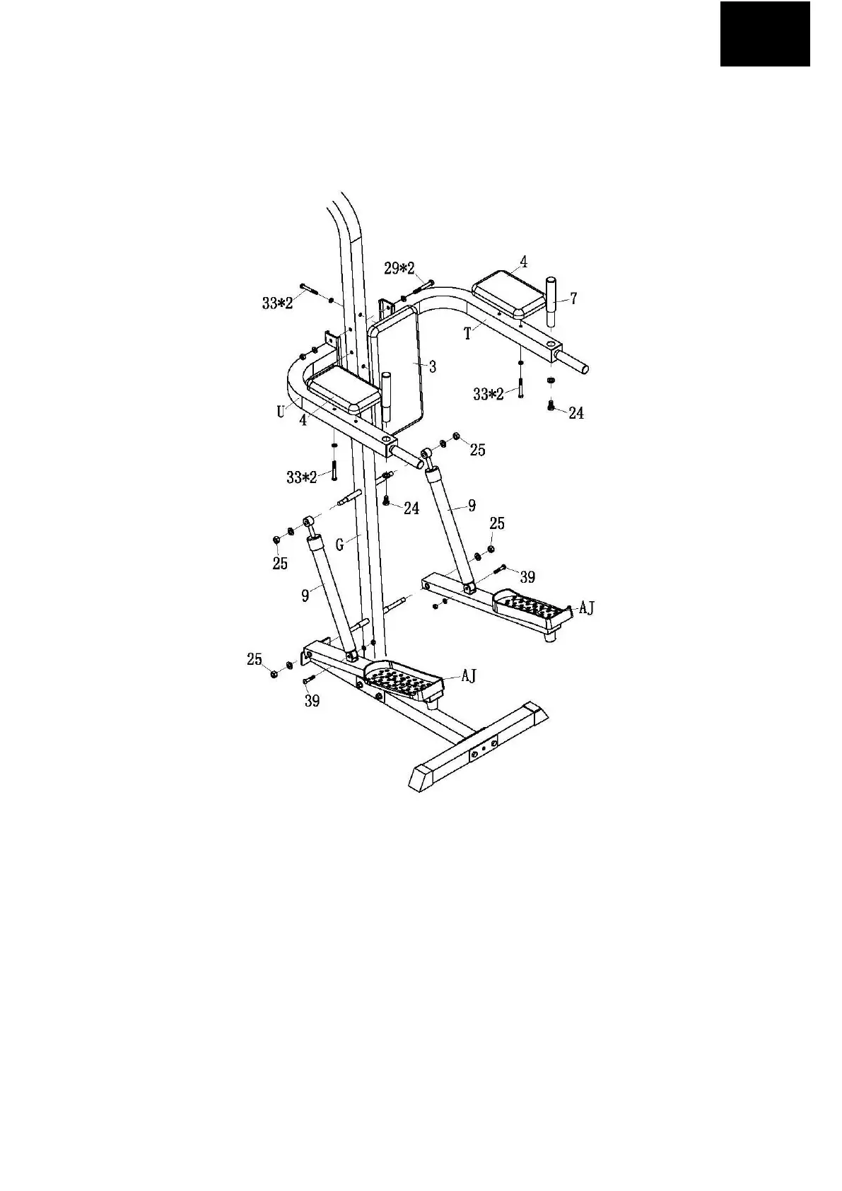 1. ATTACH ARM REST BEAM (T&U) TO LEFT VERTICAL BEAM (G) WITH TWO