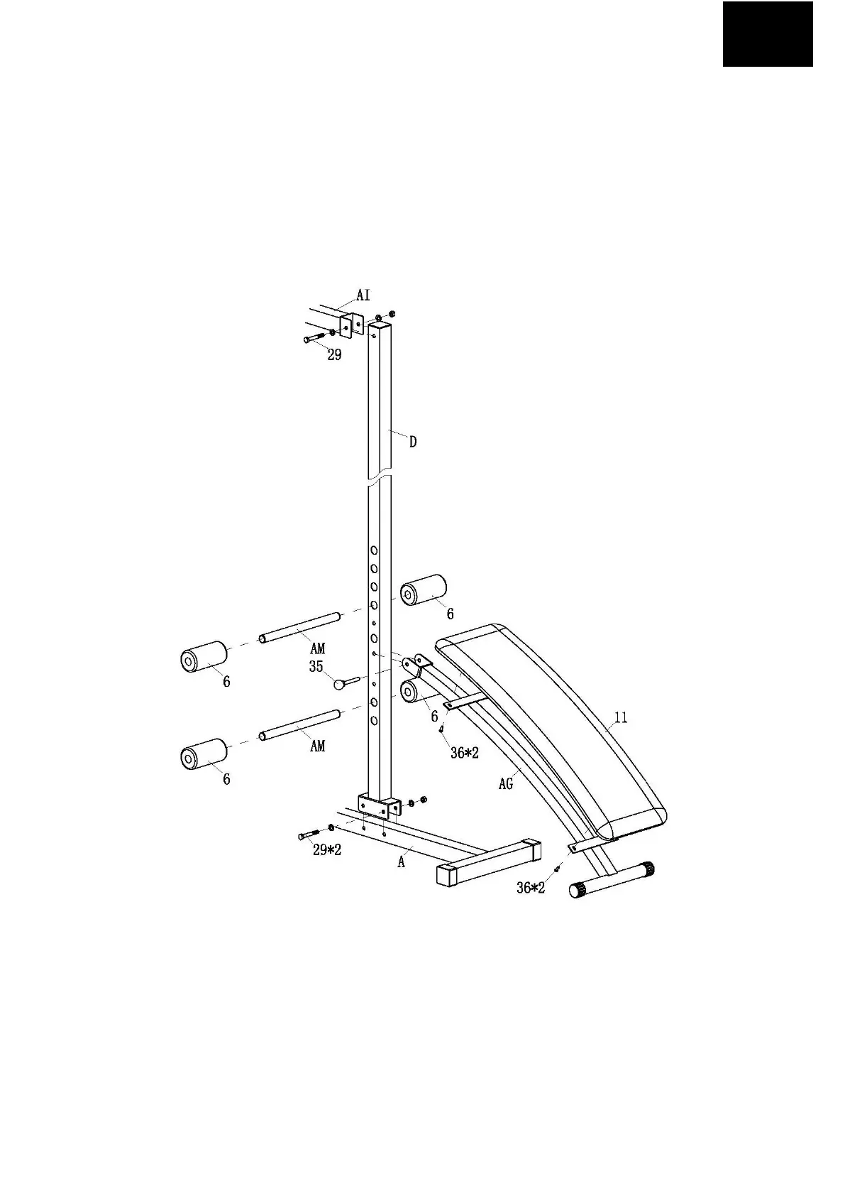 2. BEFESTIGEN SIE DEN POLSTERSITZ (11) MIT VIER SCHRAUBEN M6*16 (36) AN DER BANKSTÜTZE