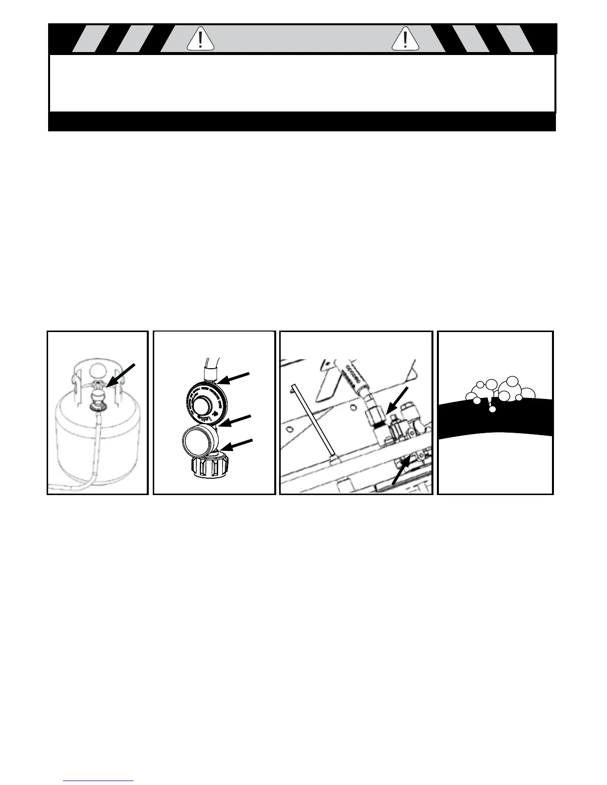 gaz et serrez le raccord qui fuit. Si la fuite est présente le long du tuyau, ARRÊTEZ TOUT : n'utilisez pas