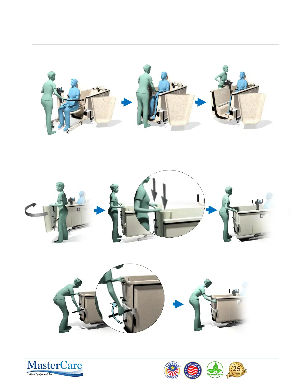 To transfer the individual into the tub, back the Transporter chair into the tub using the and Transporter Guide Handle.