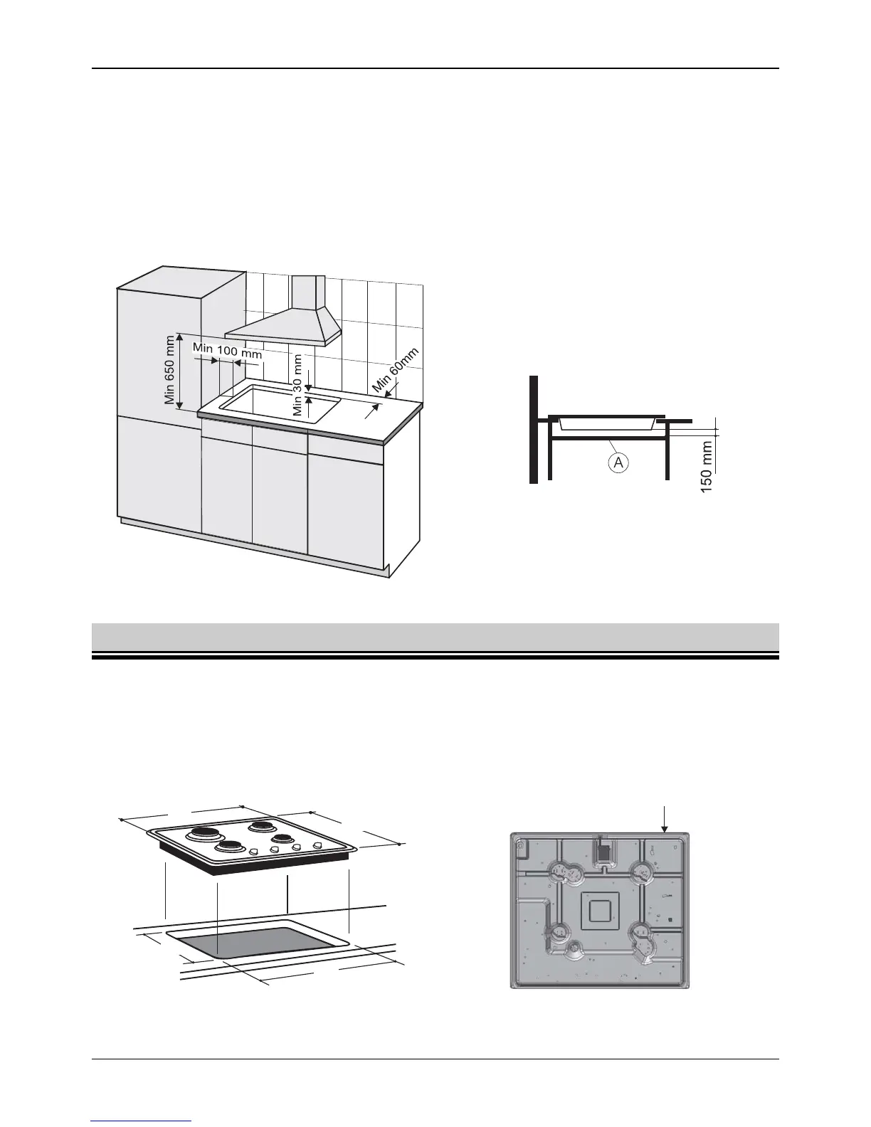 Jeżeli pod płytą gazową będzie umieszczona pozioma przegroda „A”, odległość pomiędzy płytą i