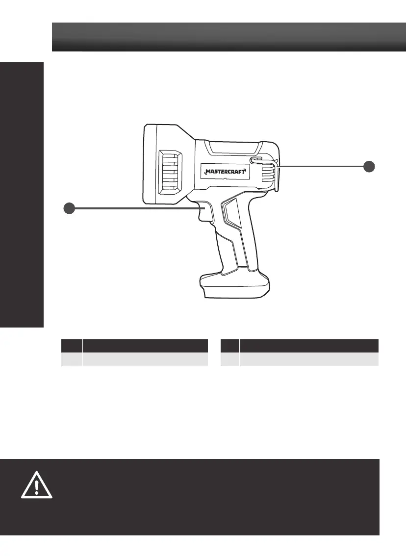 • If any part of the spot light is missing or damaged, do not attach the battery pack to the tool or use the tool until the part has