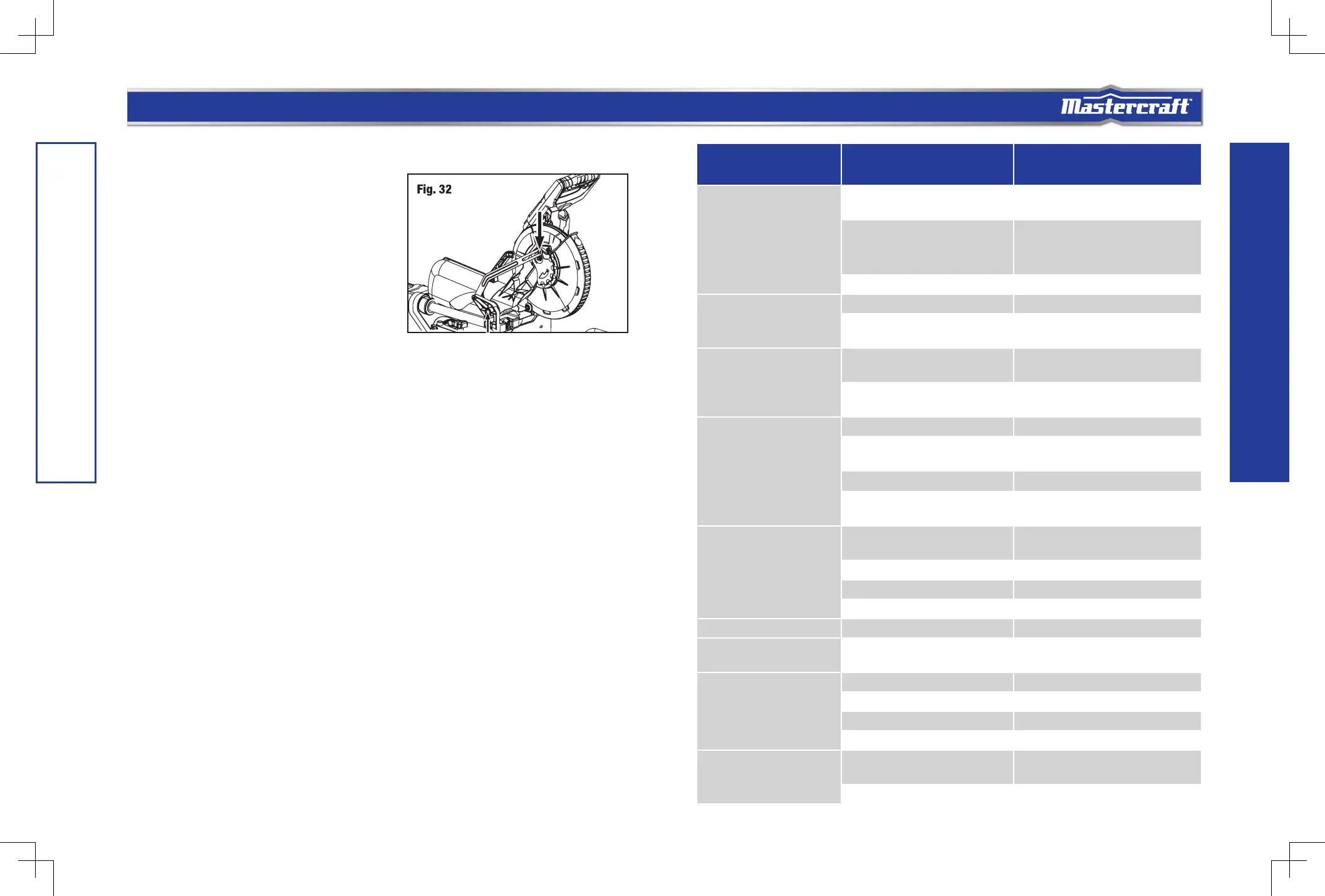 Blade hits table Misalignment See “Assembly and adjustments”