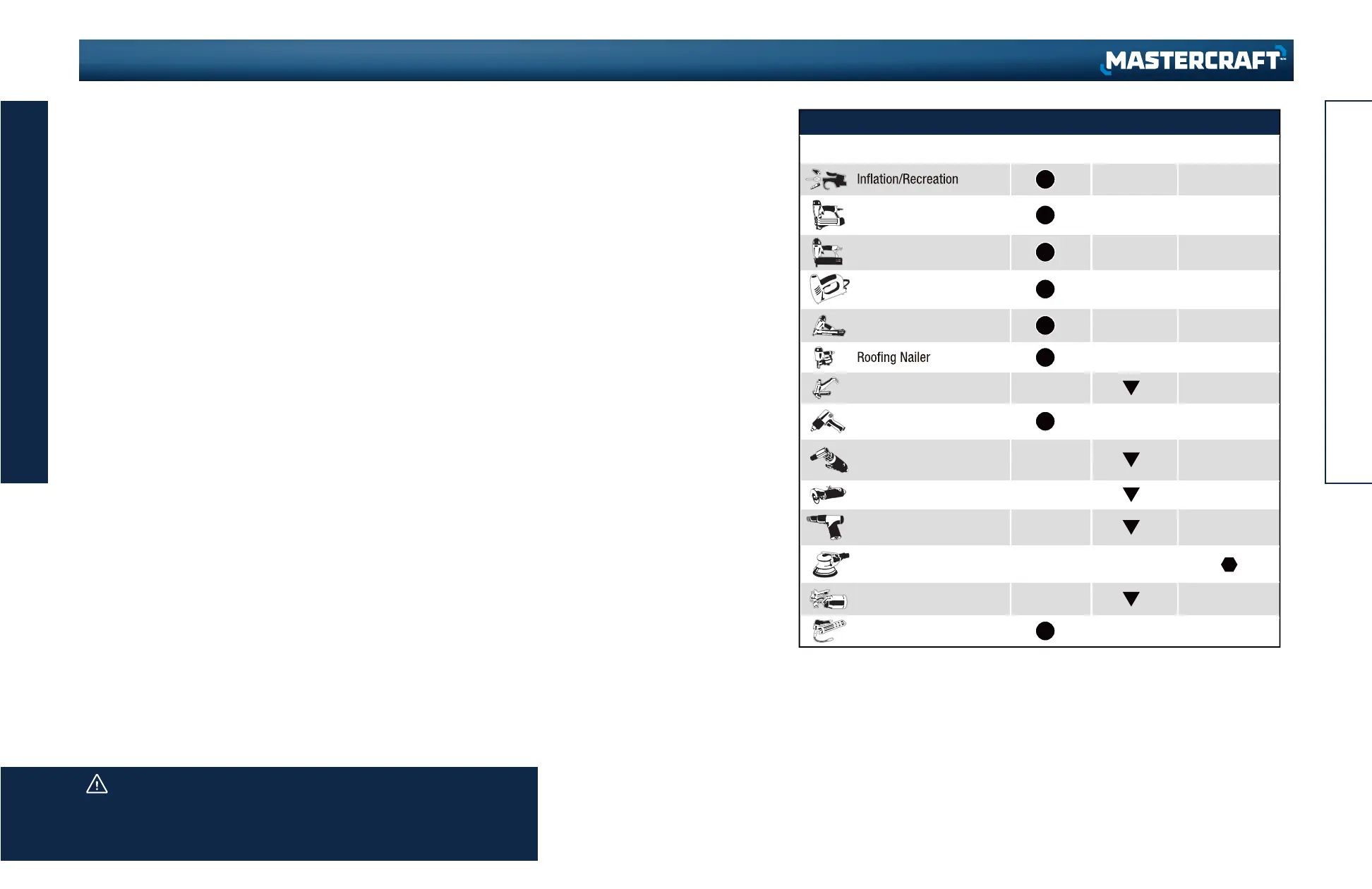 Always ensure the use of appropriately matched air tools with your Mastercraft
