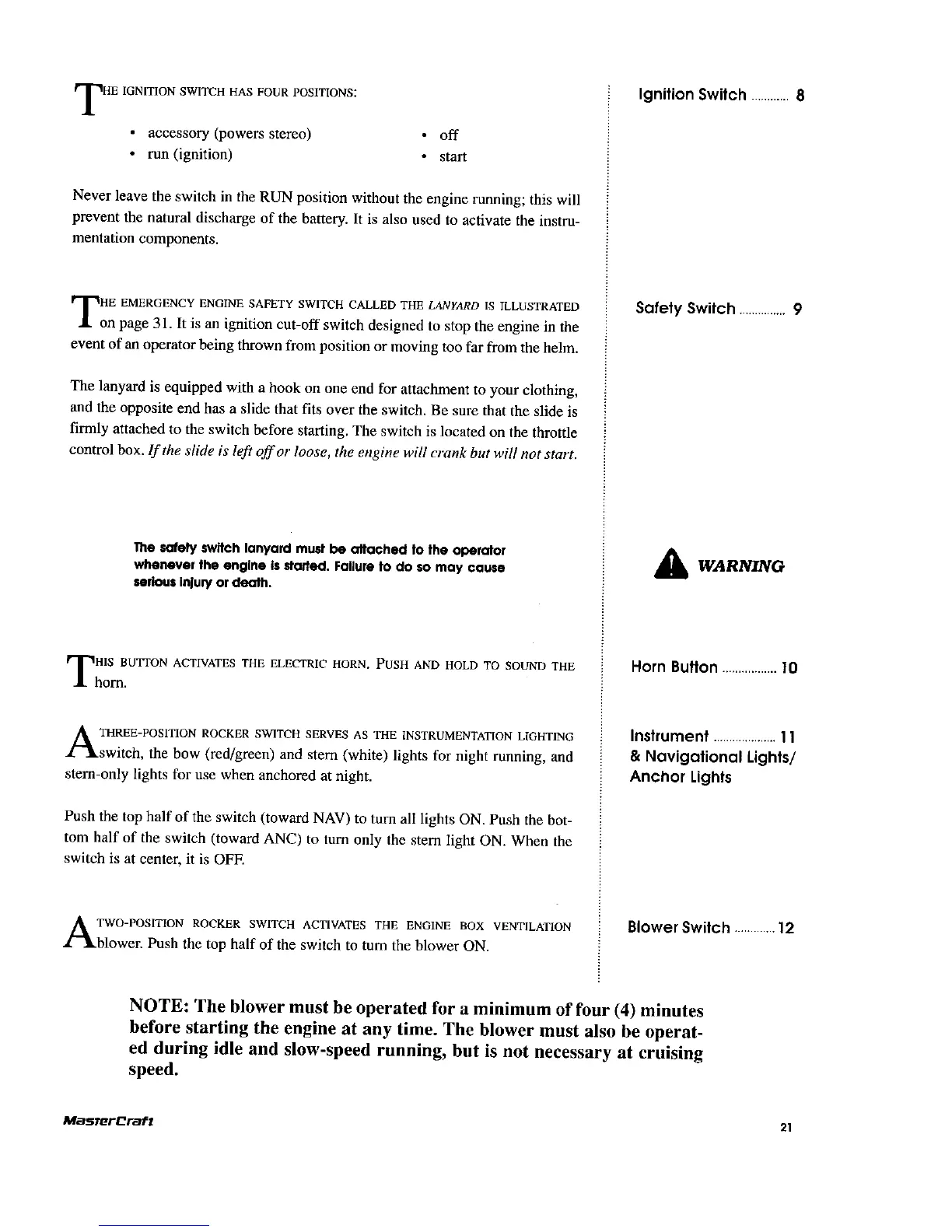 MasterCraft 1999 MariStar 210 - Ignition, Switches, and Lighting; Ignition and Safety Switches; Horn, Lights, and Blower Controls