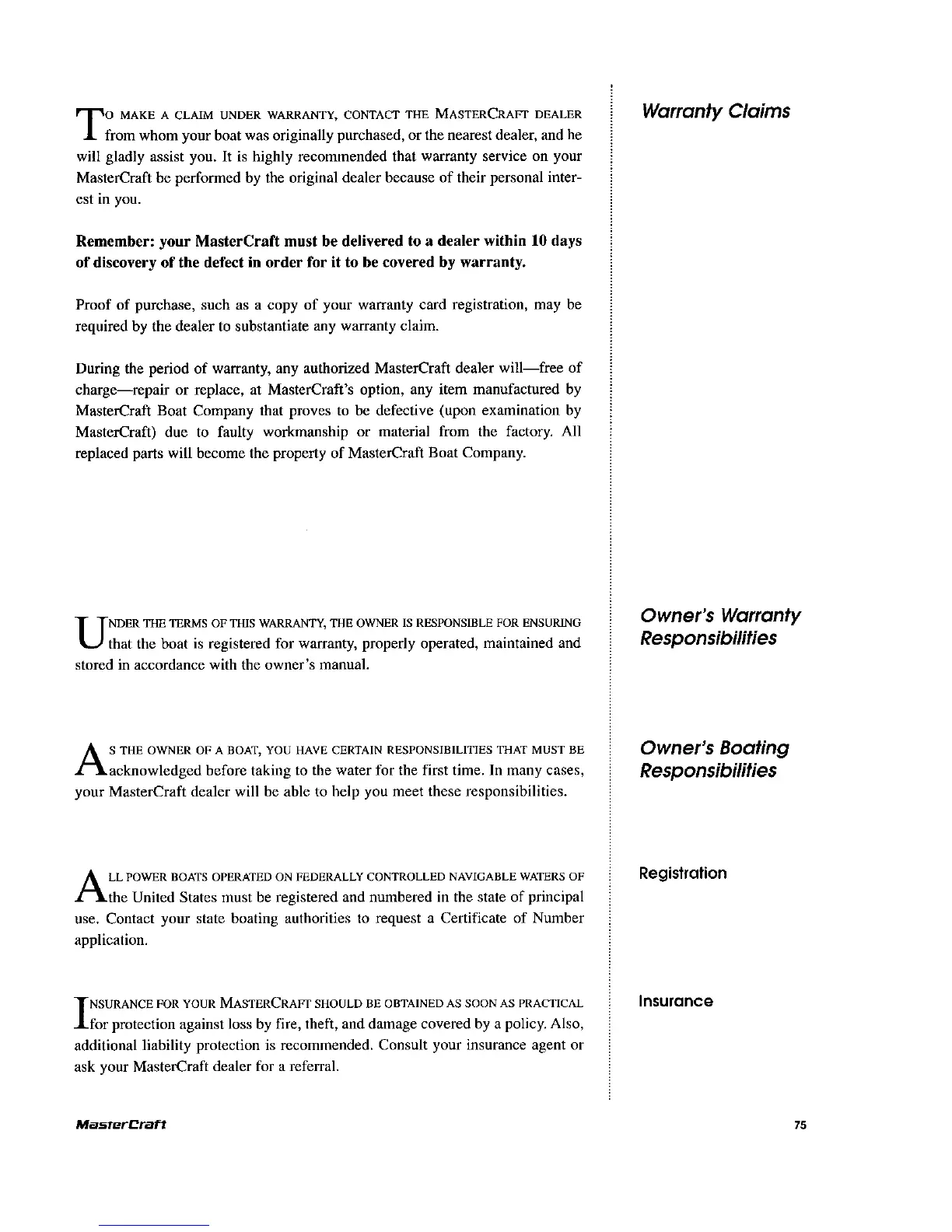 MasterCraft 1999 MariStar 210 - Warranty Claims and Owner Responsibilities; Insurance and Registration Requirements