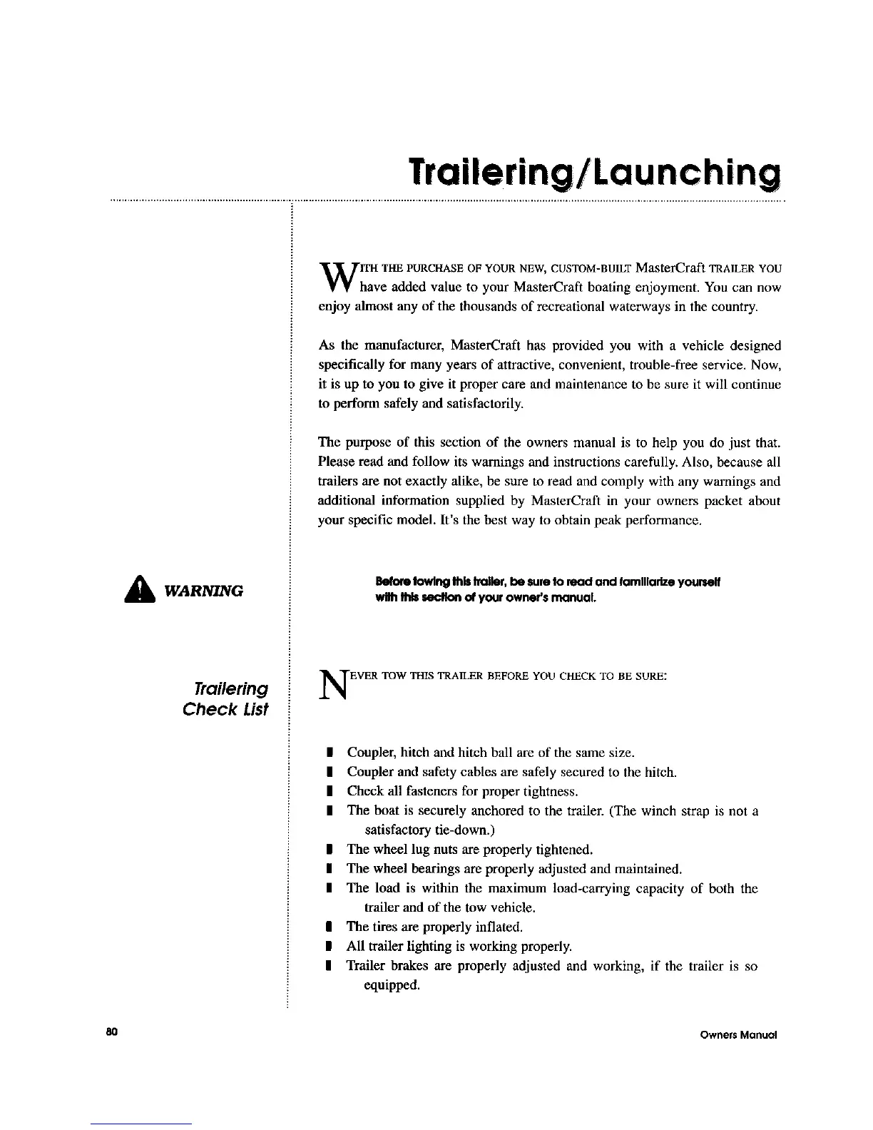 MasterCraft 1999 MariStar 210 - Trailer and Launching Procedures; Trailerizing Pre-Tow Checklist