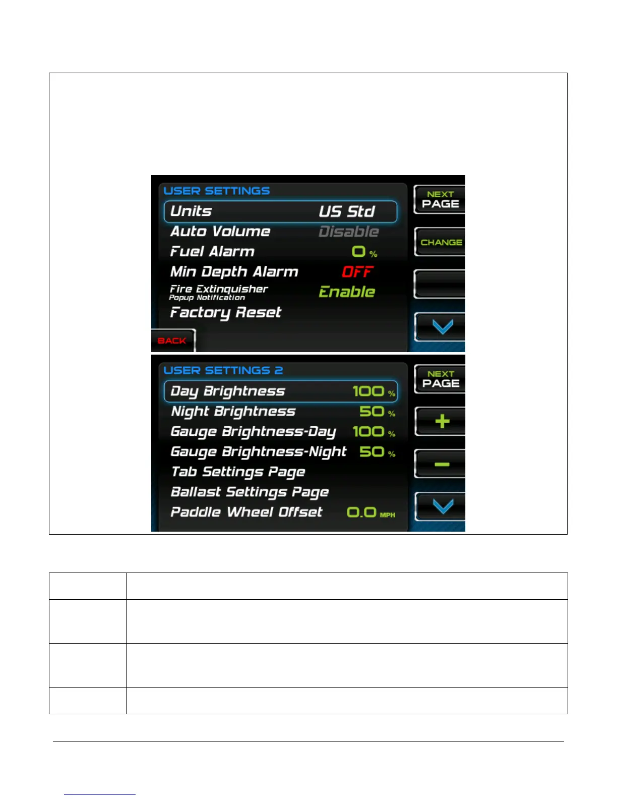 NEXT PAGE – advances to the next or previous page of settings.
