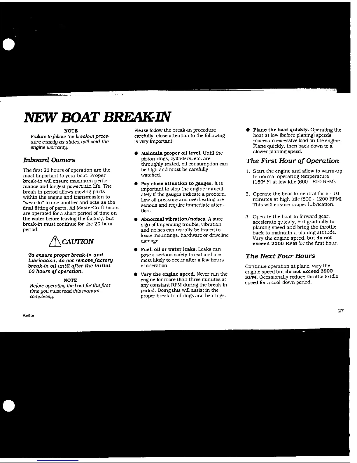 MasterCraft maristar 200 - NEW BOAT BREAK-IN; Before Starting; STARTING AND BASIC OPERATION