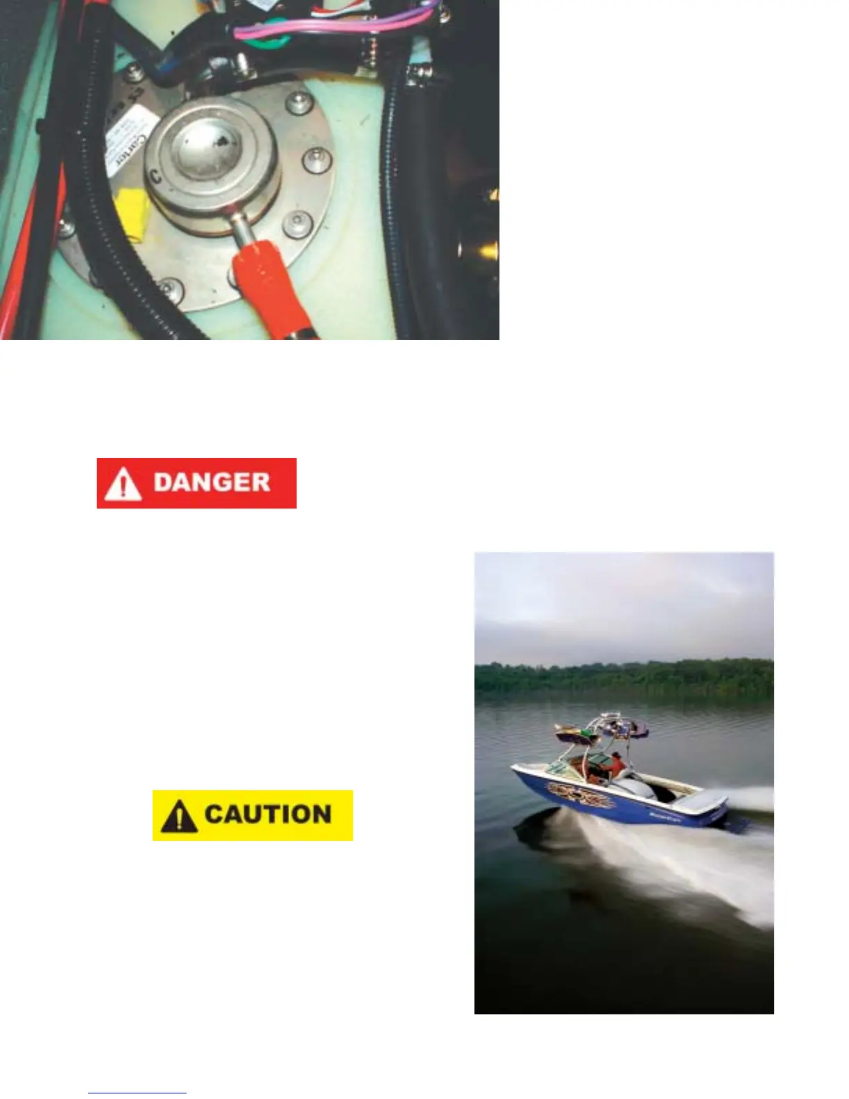 tion should take place the first time the boat is started each day. Raise the engine cover and visually look at the bilge area