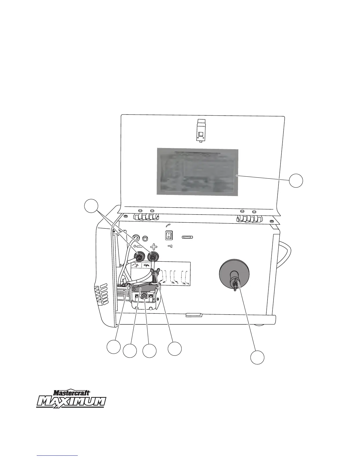 drive tension arm (2), drive roll (3), MIG gun securement screw (4), set-up chart (5), polarity