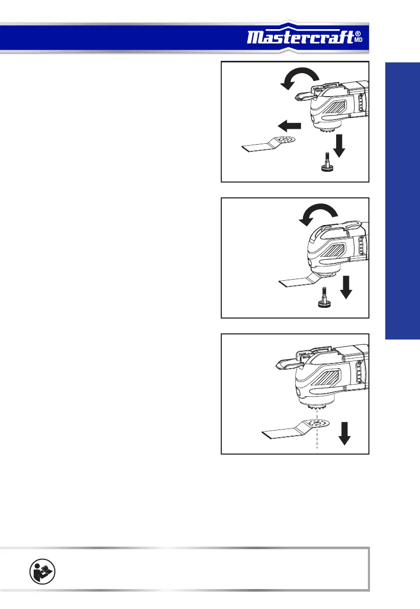 tool-less blade change lever (1) forward to the open position to