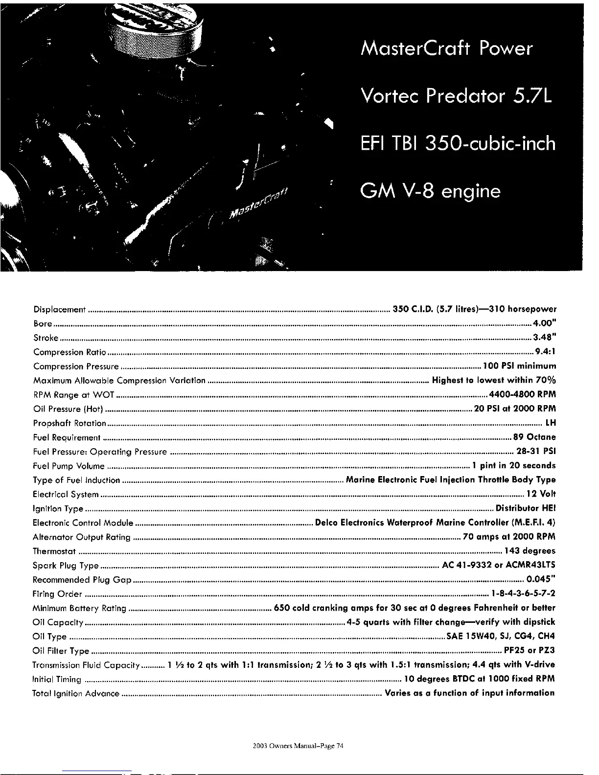 MasterCraft X-Star 2003 - Engine Specifications