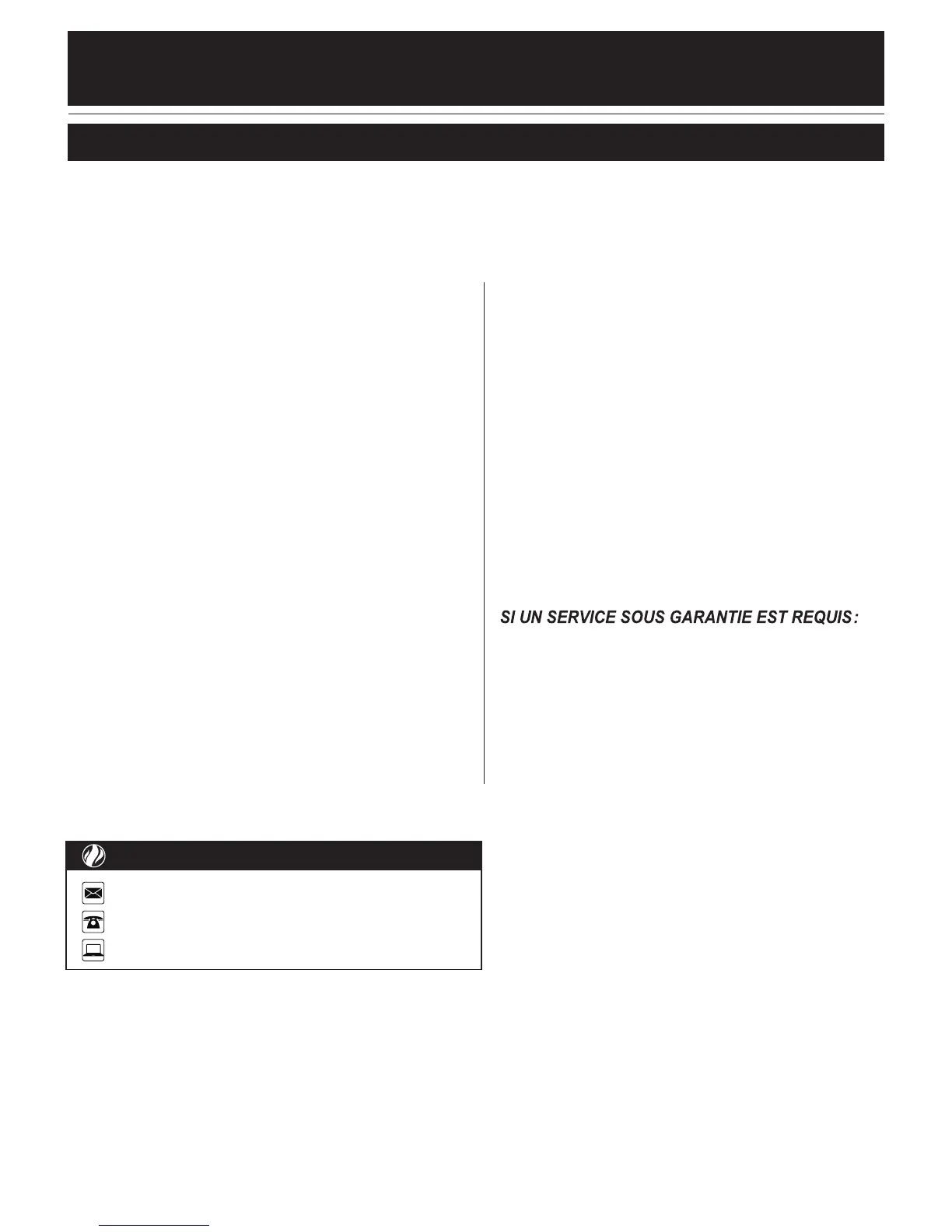 contre tout défaut de matériaux et de fabrication pour une période d’un an à compter de la date d’achat.